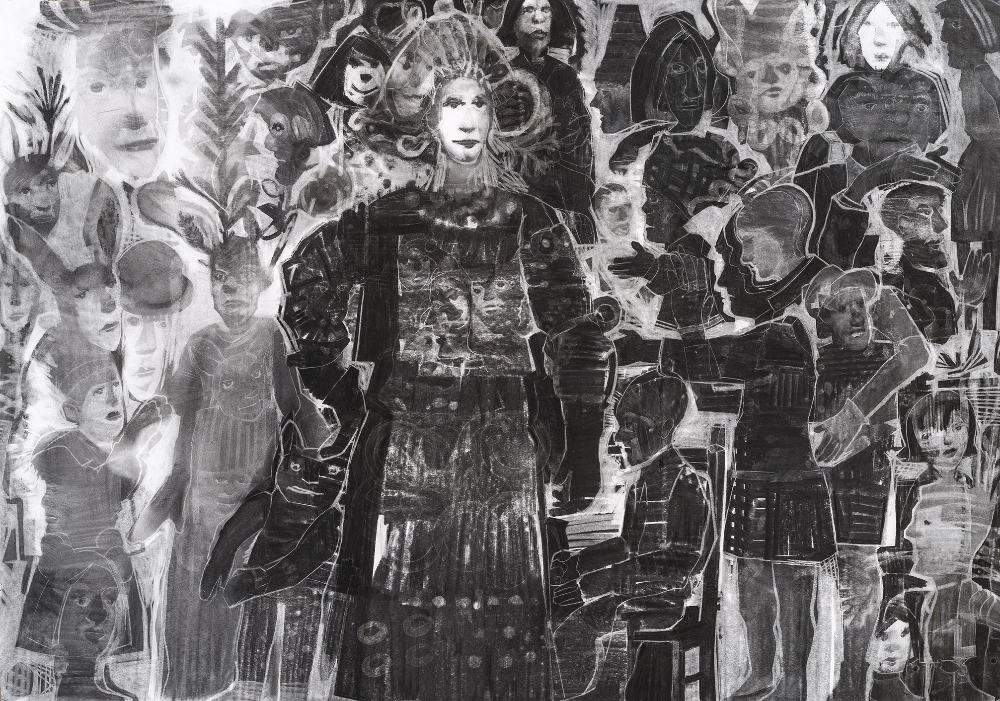 Nobles aussi comme ses chevaux et ses têtes parmi la cinquantaine d’œuvres exposées. Nobles comme ses personnages sans nom aux visages vides qu’on retrouve dans ses fusains. L’on croit y reconnaître des conquistadors espagnols, des autochtones, des figures shakespeariennes, politiques, historiques. On y voit autant de rois que de manants, des squelettes et des bustes à la façon « Île de Pâques ». On croit parfois se trouver devant des masque de rituels pré-hispaniques ou des visages de personnages de théâtre grec. D’autres font penser à des blessés de guerre ou même à des zombies ou des momies.