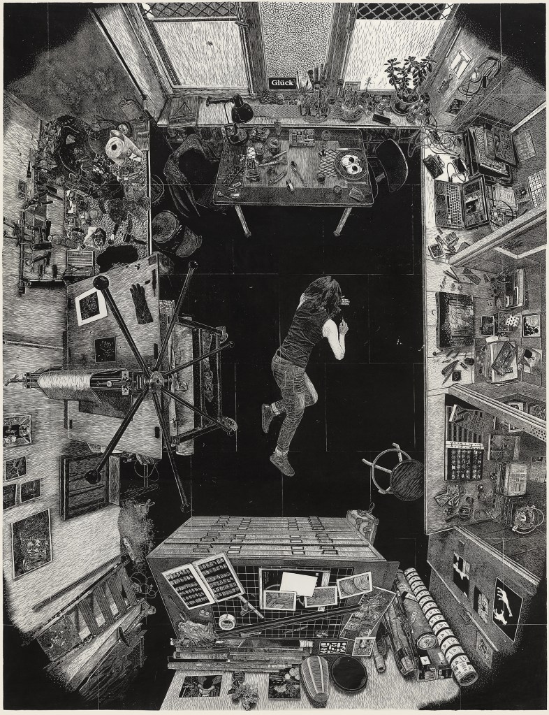 Enfin, l’artiste française Ariane Fruit est exposée pour la première fois à Montréal au 1700 La Poste. Formée en photographie, elle crée des linogravures grand format qui utilisent la perspective – voir Scène de crime ci-haut – pour nous donner l’impression d’un vacuum spatio-temporel où, dans ce cas précis, l’artiste semble dessiner un ciel de nuit au plancher.