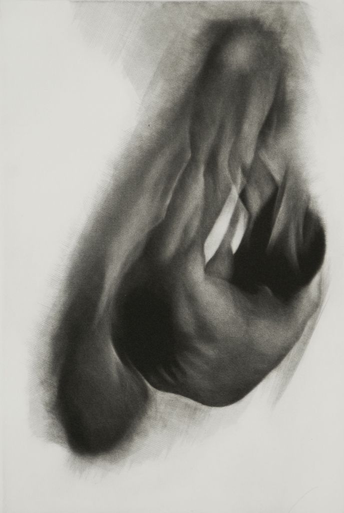 Guy Langevin nous présente principalement des corps en mouvement. L’artiste originaire du Saguenay, qui dit être venu à la manière noire pour la lumière, utilise le caractère physique dans une perspective humaine plus large. Maître du gris, il cherche et trouve le mouvement. Il est à l’affût des sensations provoquées par le velouté de l’encre pour se rapprocher ainsi de certaines émotions.