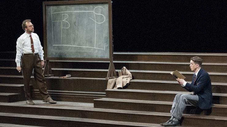 Dès le départ, la conception scénique de Jean Bard (prix de la critique 2017-2018) évoque la froideur et la discipline d’un collège américain des années 50, la Welton Academy. Un escalier monumental occupe toute la scène, qui pourra devenir, c’est selon, l’entrée de l’institution, une salle de classe ou la grotte où se réfugient les élèves du professeur Keating afin de recréer la dite société des poètes disparus.