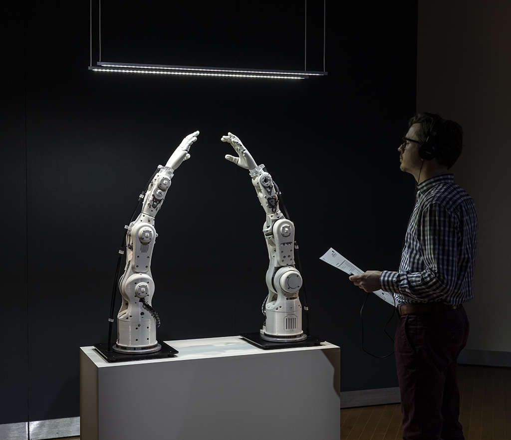 Les autres travaux de cet artiste sont sur le même mode. Il s’agit de pièces animées qui témoignent de mesure, de mouvement dont on ne perçoit pas qu’ils aient une fonction utilitariste ferme, affichée. Plus souvent qu’autrement, ils ne jaugent ni n’accomplissent rien de fondamental ou d’important. Deux bras mécaniques, par exemple, dressés à la vertical, rapprochent leur mains articulées avec lenteur, jusqu’à ce que l’espace qui les séparent se réduise à peu de chose.