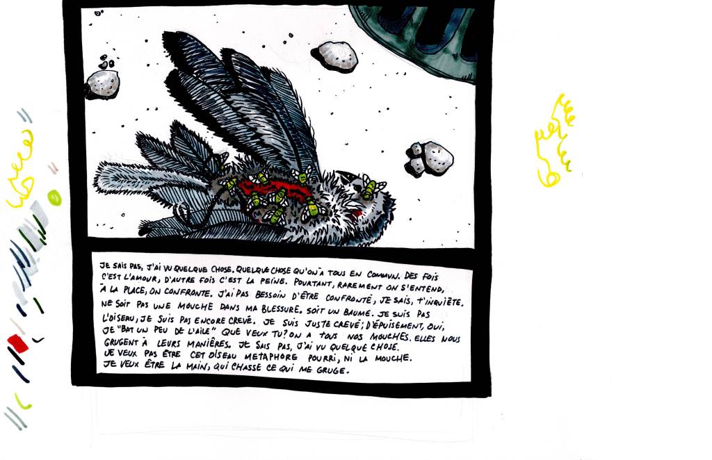 Le narrateur semble incapable de se questionner sur les raisons profondes des manques qu’il vit. Il est en panne. En ce sens, cette étape peut paraître encore plus dure que la peine. Mais le style de Félix Crépeau est toujours de faire de l’équilibre sur un mince fil en contrebalançant propos sombre et illustration luxuriante. Entre le noir et la couleur.