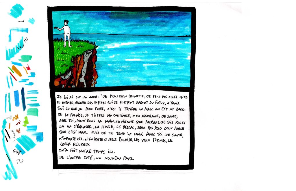Dans La panne d’amour de Félix, la technique diffère quelque peu. La plume de l’auteur a pris du gallon, le texte une assurance et une qualité supérieure, faut-il dire. L’auteur s’expose en pleine page avec nombre de métaphores et de réflexions intercalées entre des illustrations qui ont gagné en précision et en finesse.
