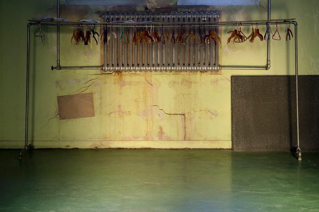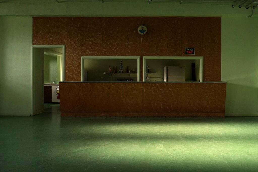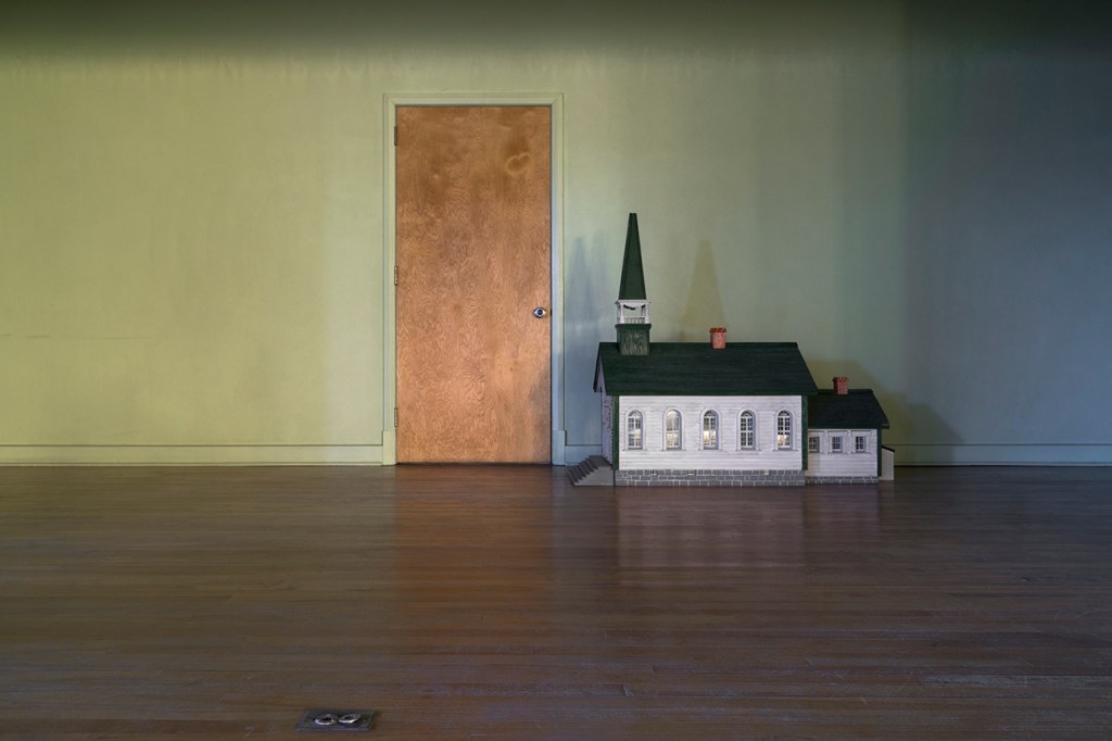 Tout baigne dans une couleur très vert d’Irlande. Ce sont des scènes d’objets un rien étranges qui nous sont montrées. Il y a des trophées alignés sur une tablette, des figurines, un comptoir derrière lequel apparaissent des appareils de cuisine. On imagine les réunions tenues là, des activités de paroisse et de village, le lieu de rassemblement qui semble depuis longtemps oublié. Un escalier, un porte-manteau nous aident à nous repérer quelque peu, ponctuent notre marche au sein des images.