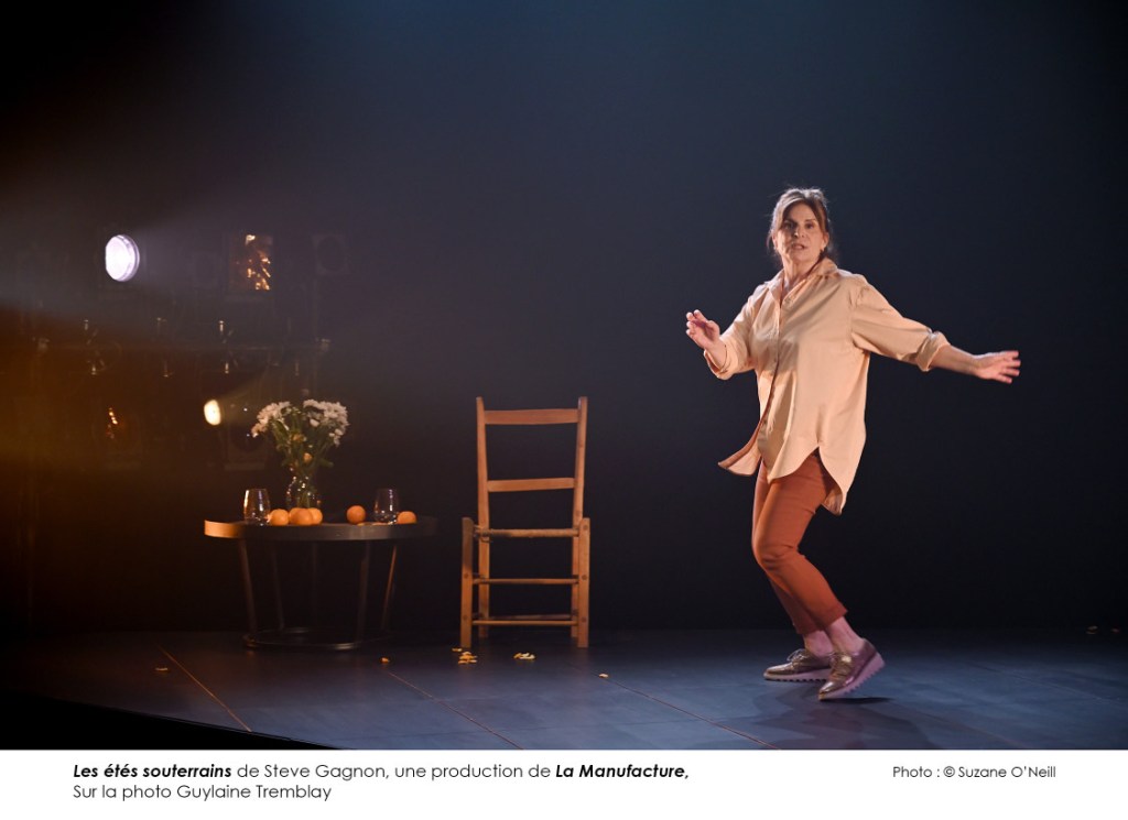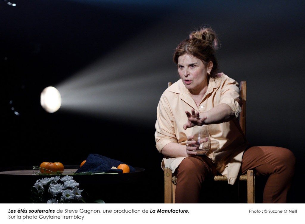 Un mur-écran, trois chaises, un fauteuil roulant, deux tables, des fleurs et des dizaines d’oranges. Le décor et les accessoires du spectacle Les étés souterrains laissent toute la place à Guylaine Tremblay pour déambuler entre les joies de l’amitié et les affres de la maladie, l’émotion suscitée par un parfum de lavande et la juste colère face à la misogynie, la force et l’exubérance de son personnage et sa dégénérescence physique graduelle.
