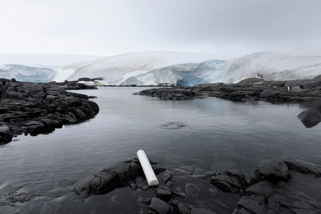 Les images, objets et bandes sonores ainsi exhibés témoignent en effet d’une action accomplie en Antarctique. Il s’agit de collaborer avec un glacier qui a recueilli en 2019 une capsule temporelle devant ressurgir, dans un futur dont on a identifié l’étendue. L’artiste a logé en ce contenant les lettres de personnalités de divers milieux.