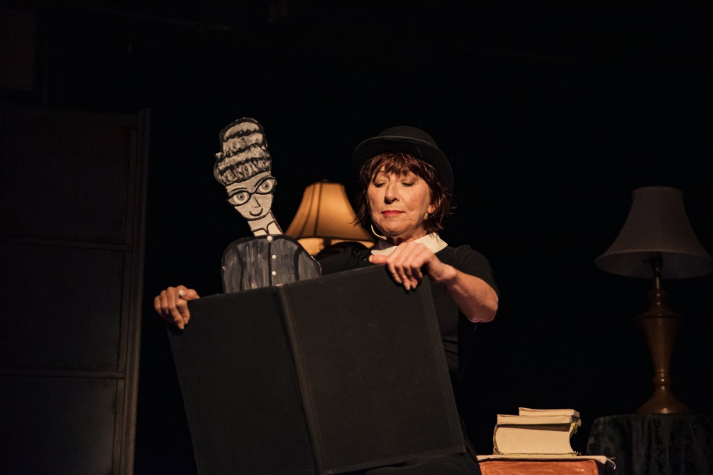 Sur la petite et chaleureuse scène du Théâtre de l’Esquisse, Julie Vincent est accompagnée de la marionnetiste Paola Huitron et du musicien Michel Smith ainsi que de son ingéniosité incomparable. En plus des marionnettes, dont elle fait toutes les voix, le théâtre d’ombres, les projections, les enregistrements… elle utilise sa grande palette de comédienne qui sait passer d’un extrait d’audition dramatique à un clin d’oeil amusé au public en une pirouette, sans oublier qu’elle chante aussi admirablement.