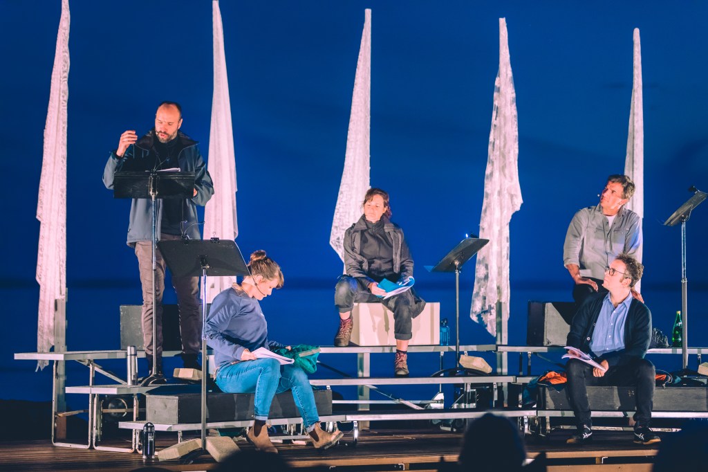 Philippe Cyr a mis en scène la pièce présentée l’an dernier à Carleton-sur-mer. Au FTA, c’est Johanne Haberlin qui prend sa relève à Montréal. Catherine Audet, Pierre-André Bujold, Kevin Doyle, Johanne Lebrun et Dany Michaud en sont les interprètes. Autre différence notable, le spectacle ne se déroule pas devant la mer comme en Gaspésie, mais devant le fleuve dans le Vieux-Port.