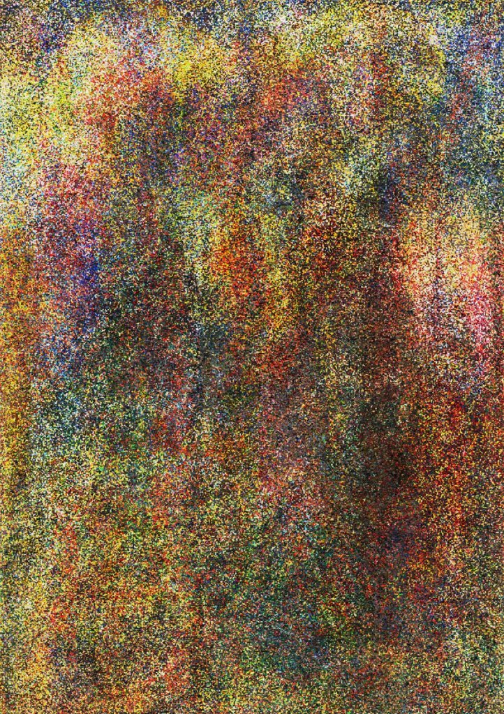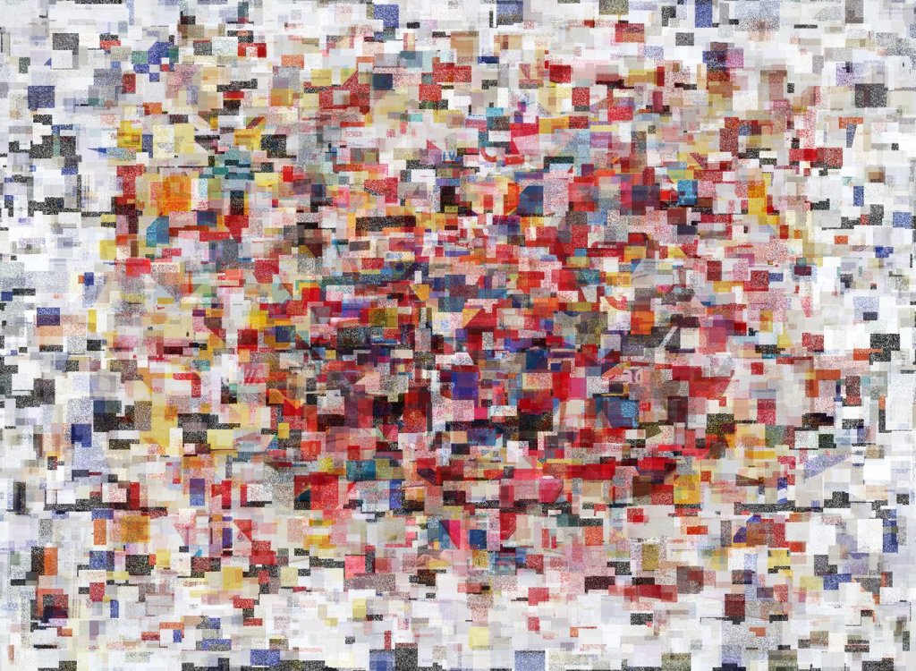 Guggenheim colour field (after Karel Appel), 2022 Archival pigment print. Computer-generated aggregate using 11 images from Guggenheim Museum collection / Impression jet d’encre. Ensemble généré par ordinateur de 11 œuvres de la collection du musée Guggenheim. 36 x 25 in. 92 x 64 cm