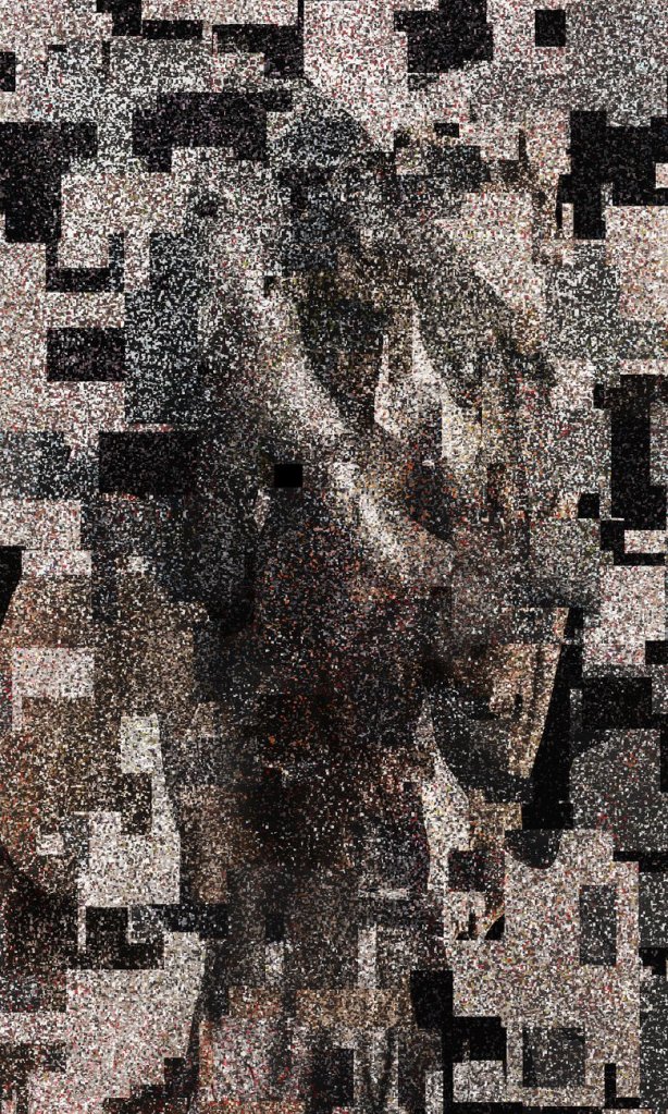 Pour l’oeuvre inspiré de Gary Hill, c’est, par exemple, Bathing qui sert à partir le bal. Mais quels sont précisément les paramètres que se donne le logiciel ? On peut imaginer que des questions de formes, de textures et de sujets sont à la base de la recherche qu’il accomplit pour le bénéfice de l’oeuvre à venir comme de l’artiste. À ce stade, celui-ci ne se limite évidemment pas à reprendre tel qu’on le lui suggère le bilan de la recherche opérée par le logiciel. Il influe sur les données, guide le processus quelque peu et établit une sorte de seuil d’acceptabilité qui lui permet de limiter le nombre d’images proposées.