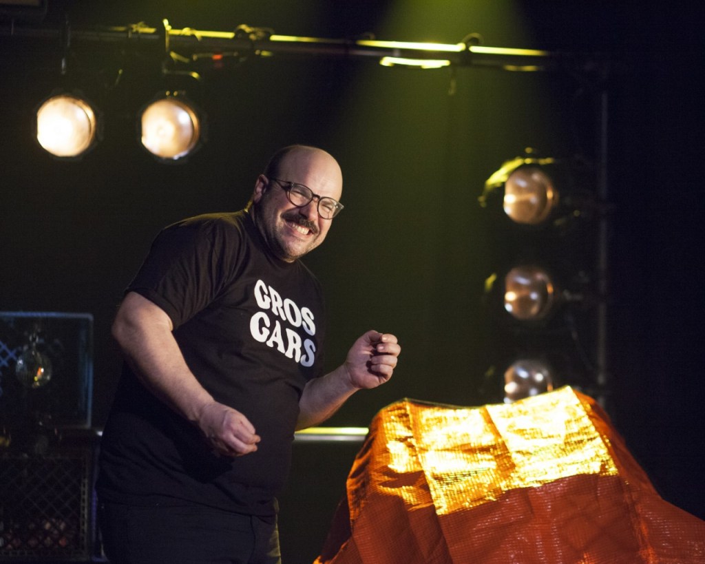 Mathieu Gosselin a présenté son spectacle Gros gars en pleine pandémie à la Licorne en 2021 devant un public en jauge réduite. Il l’a revu et corrigé afin d’en proposer une version définitive au Prospero, toujours dans une mise en scène de son amie Sophie Cadieux.