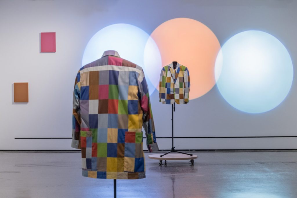 Pour illustrer cette condition et souligner leur parenté artistique sur ce point, Henricks a choisi de solliciter les couleurs issues de la palette de l’artiste américaine et d’en mettre littéralement partout ! Il occupe, pour ce faire, un mur entier sous forme de papier peint fait de carrés colorés. Ceux-ci se montrent en plus dans des tableaux, se pendent aux basques de costumes qu’a spécialement conçus l’artiste pour l’occasion et qu’il revêt dans une vidéo de 10 minutes. Ledit costume est d’ailleurs là, présent dans l’espace, enveloppant un buste.