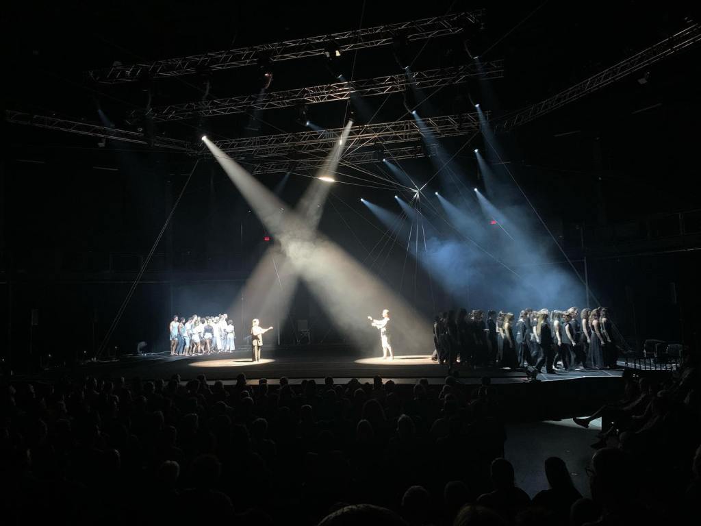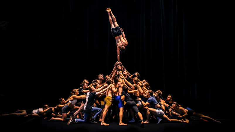 Spectaculaires banquines, main-à-main, portés, roulades, culbutes, colonnes à deux, trois et même quatre se succèdent au cours de la représentation avec un souci constant d’originalité dans les figures proposées. Les images créées vont du pont traversé (avant et après la pandémie ?) à une sculpture humaine en forme de cathédrale, accompagnée d’un Magnificat interprété par le chœur.