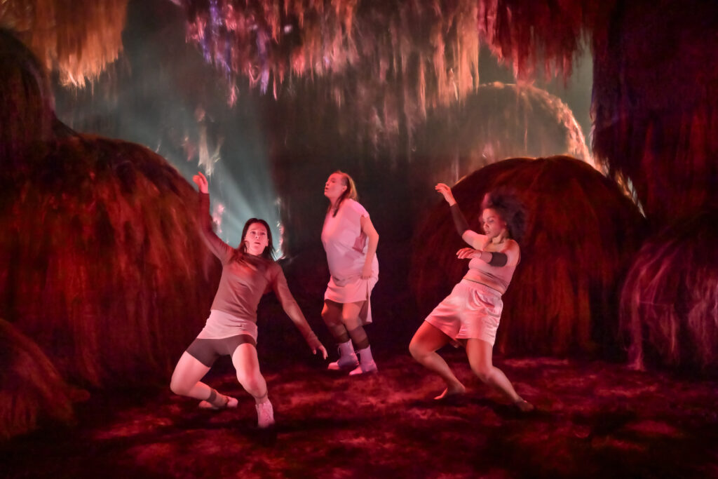 La scénographie est donc à l’avenant. D’immenses boules de poils pendent, violacées, depuis le haut et créent un environnement qui évoque une grotte issue d’un univers de science-fiction. Comme si on avait employé des masses pelucheuses pour orner une caverne dans un épisode du Star Trek original, si ce n’est qu’en beaucoup plus léché, un rien hyperréel. Il s’en dégage des relents de fioritures esthétiques et de références lointaines, le cumul présentant des relents de grotesque.